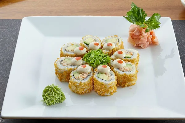 Deep fried roll with cream cheese wrapped in sushi rice and seaweed