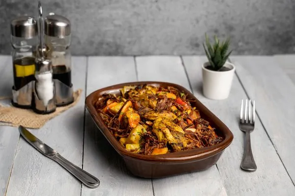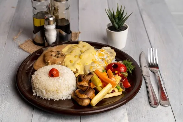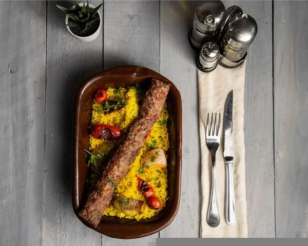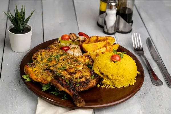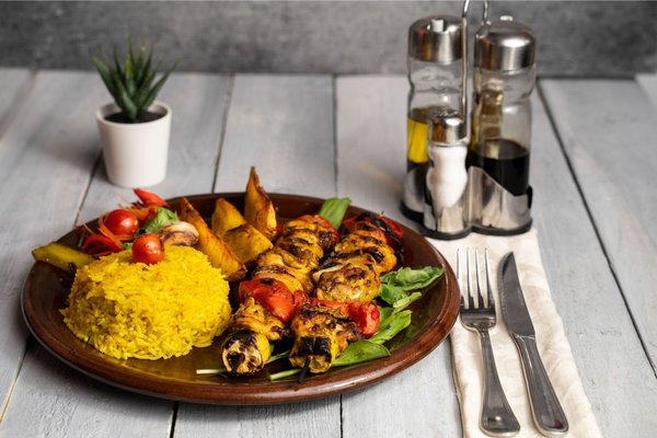 Shish tawook, garlic dip, our special healthy pickles and grilled colored pepper