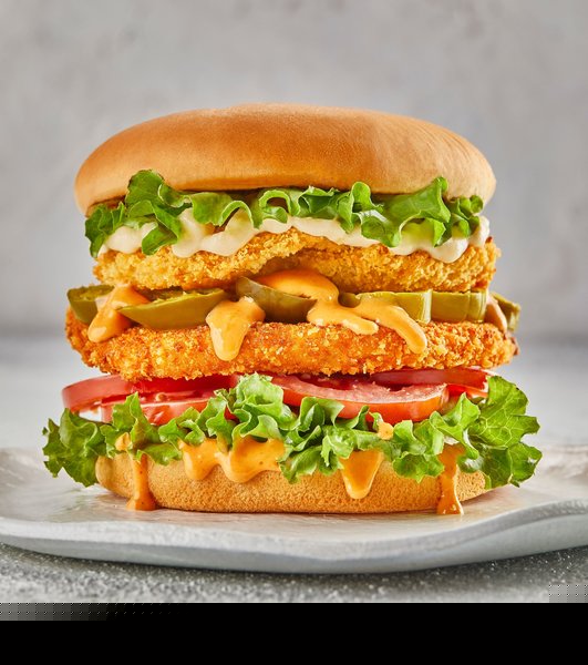 Jalapeno chicken burger, lettuce, pickled cucumber, onion rings, smoked beef, cheese slice, spicy hung sauce, cheese sauce and hung sauce
