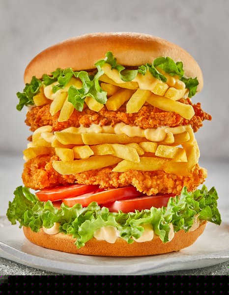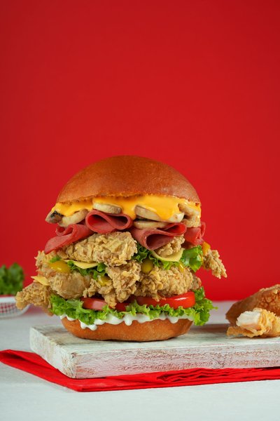 2 original crispy fried chicken pieces, lettuce, tomato, pickled cucumber, mayonnaise, smoked beef, cheese sauce and ranch sauce