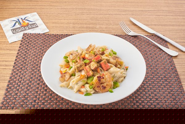Shrimp pieces, grilled crab sticks, tartar sauce, green pepper