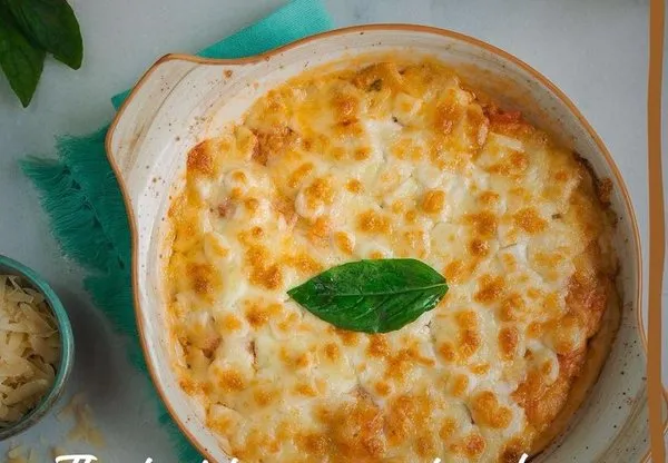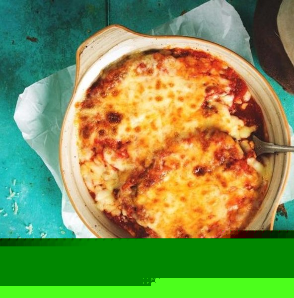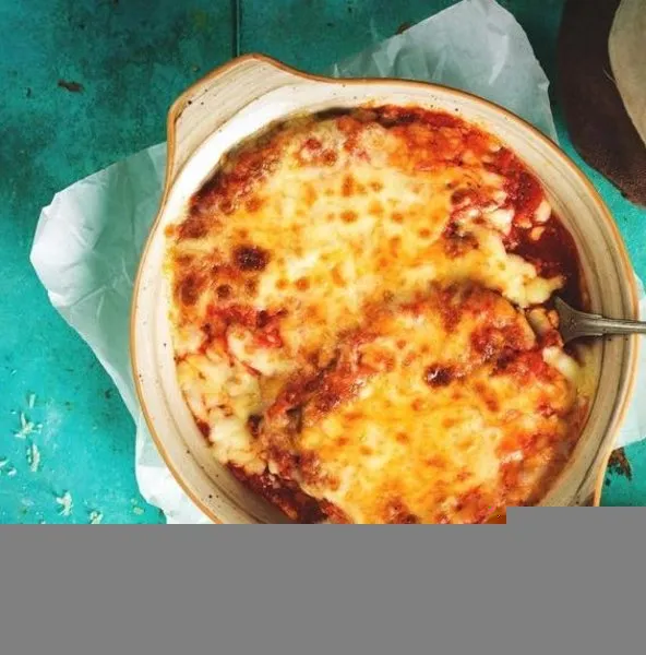 With minced beef, green peas, ricotta cheese, mozzarella, parmesan cheese and tomato sauce