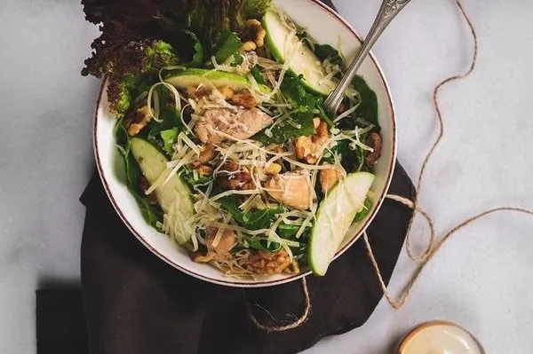 Green apple, arugula, parmesan cheese, chicken, walnut, mustard and vinegar dressing