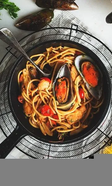 Shrimp, calamari, mussels, fish topped with cherry tomato