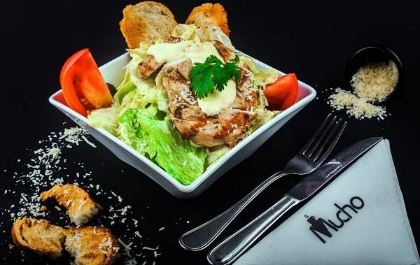 Grilled chicken slices, iceberg lettuce, parmesan cheese and garlic croutons, served with caesar dressing
