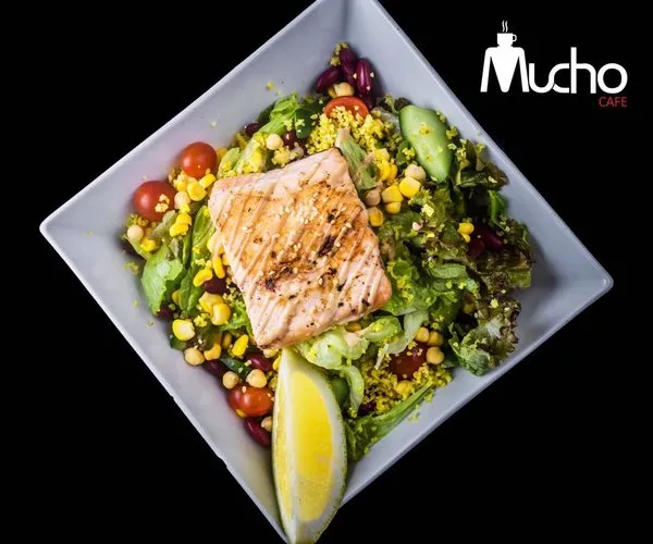Grilled salmon slice with vegetables, quinoa, yellow corn, hummus and red beans, served with balsamic mayonnaise