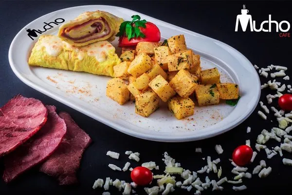 Omelette with fresh vegetables, cheddar cheese and mozzarella cooked by our own style