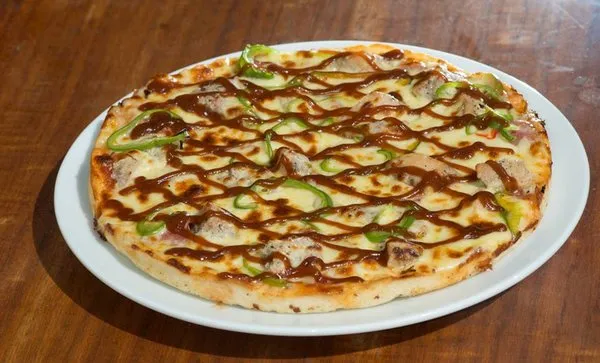 Smoked beef, smoked turkey, mozzarella, green pepper, black olives with pizza sauce