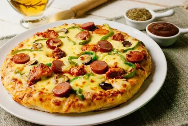 Beef, hot dog, salami, mozzarella, green pepper, black olives with pizza sauce