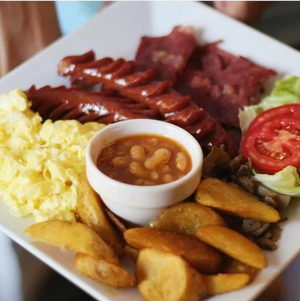 Full English BreakfastTwo baguette rolls, beef sausages, beef bacon, baked beans, mushrooms, eggplant, potato wedges, butter, & choice of eggs |