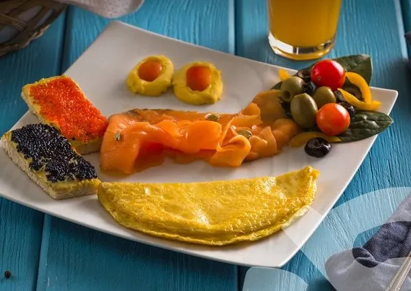 Sliced smoked salmon topped with capers and caviar, eggs French way on toasted bread
