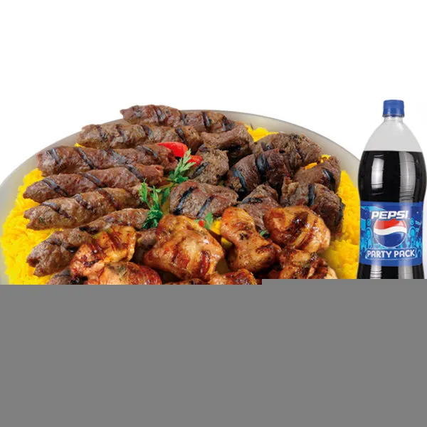 8 kebab pieces, 8 shish tawook pieces, 8 meat kofta pieces, family rice, fries, 5 puri bread, pickles, garlic dip, tehina, 1 liter pepsi