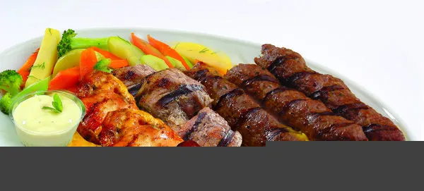 3 meat kofta pieces, 3 kebab pieces, 3 shish tawook pieces