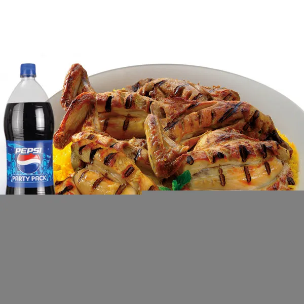 6 chicken pieces, family rice, 3 puri, large fries, pickles, tahina, garlic dip, 2 meat sambousek, 2 cheese sambousek, 2 kobeba and liter pepsi