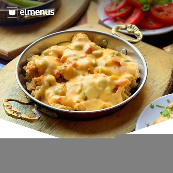 Fried chicken with cheese sauce, served with bread & fries