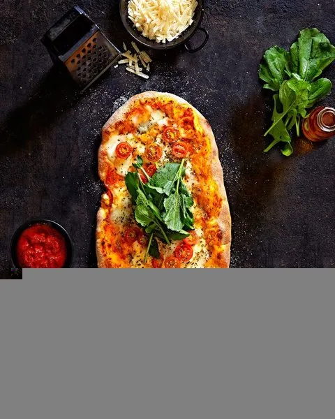 Tossed rocca leaves, fresh seasoned grilled vegetables, chopped crispy bacon, sun dried tomatoes, fresh mint pomegranate seeds and goat cheese with pesto oil and balsamic dressing