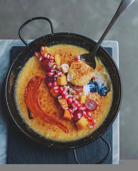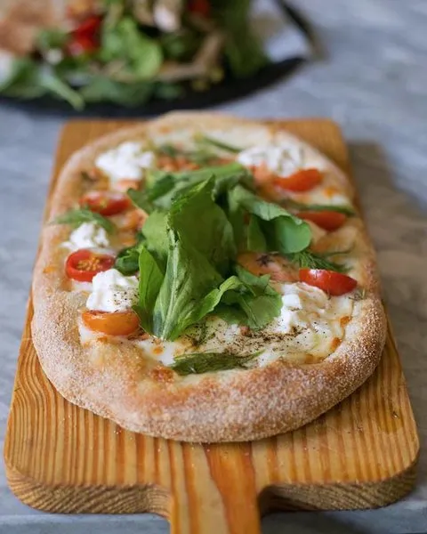 Fresh burrata cheese, oven dried baby plum tomato with chopped herbs, pesto oil and balsamic cream