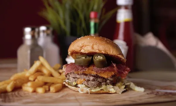 300 gm, double cheese, beef bacon, caramelized onions, jalapenos, lettuce, pickles, garlic mayo