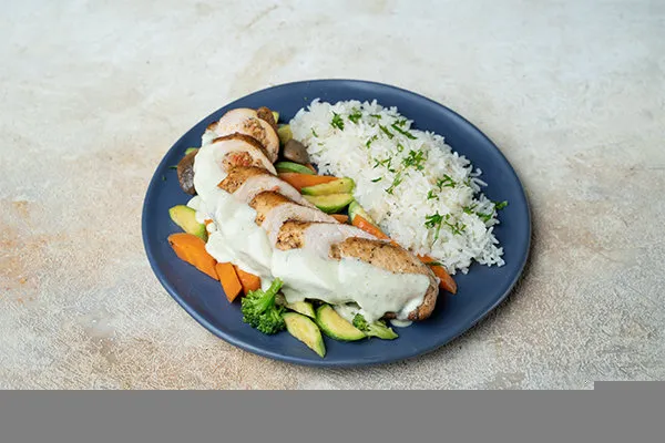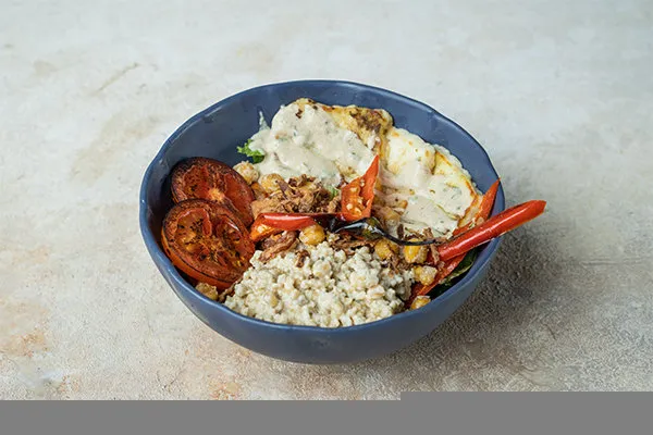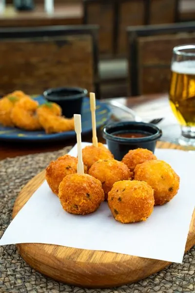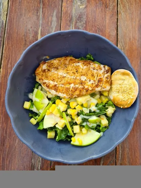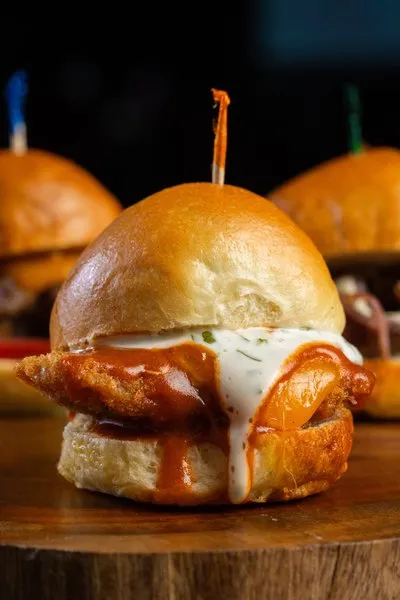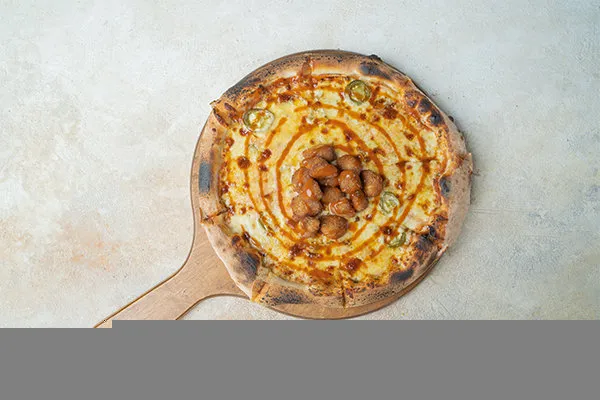 Tomato basil sauce, fried chicken bites, buffalo mozzarella, blue cheese crumbs, jalapeno