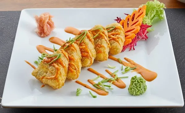 Deep fried roll with cream cheese wrapped in sushi rice and seaweed