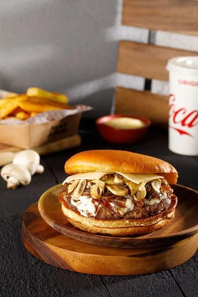 Beef patty, mushroom, black pepper sauce, caramelized onion and emmental cheese