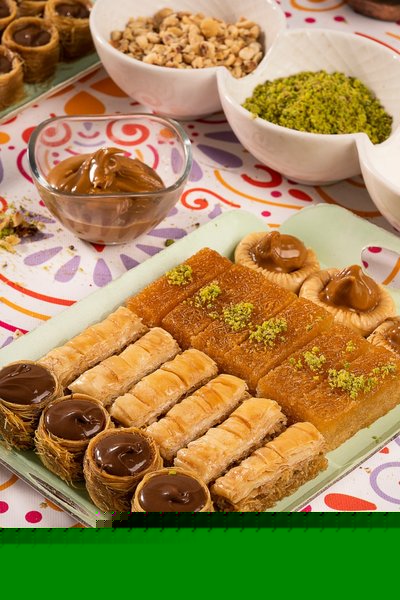 Plain kahk, kahk with malbn, kahk with ajwa, vanilla petit four with pistachio, petit four with hazelnut chocolate, ghouriba with pistachio, vanilla biscuit