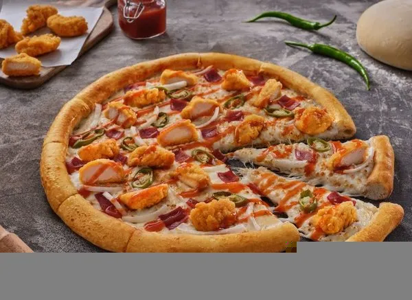 Chicken poppers, bacon, onion, spicy jalapeno pepper, mozzarella cheese, ranch sauce with buffalo sauce