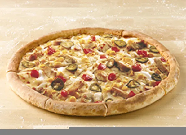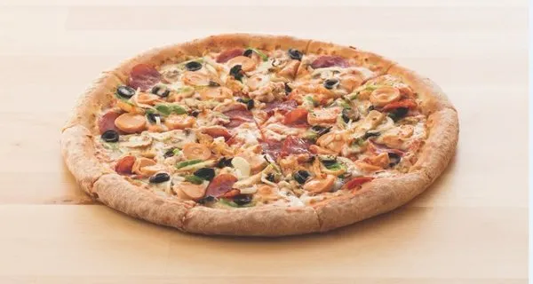 Grilled chicken, chicken sausage, chicken pepperoni, fresh mushroom, onion, green pepper and black olives