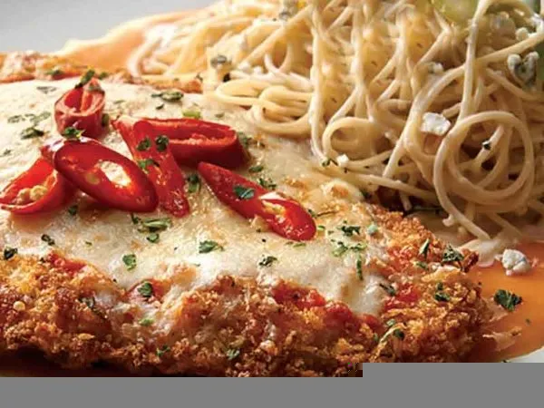 A large piece of crunchy chicken breasts, cream of mushroom, melted cheese, pasta