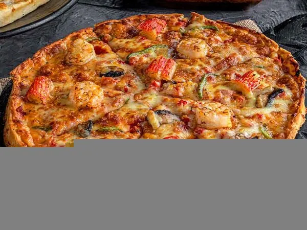 Spicy special rosada sauce, crispy pepperoni slices, mushroom, shrimp cooked with basil sauce, topped with mozzarella cheese