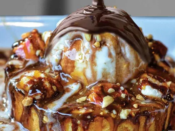 Biscuits paste , cinnamon stuffed melted chocolate, covered with marshmallow, chocolate and vanilla ice cream