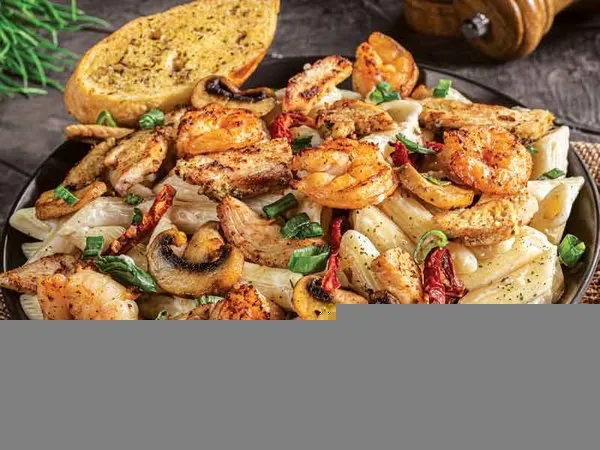 Penne pasta with chicken, shrimp and creamy lemon sauce with a mixture of dried tomatoes, mushrooms, green onions, cheese
