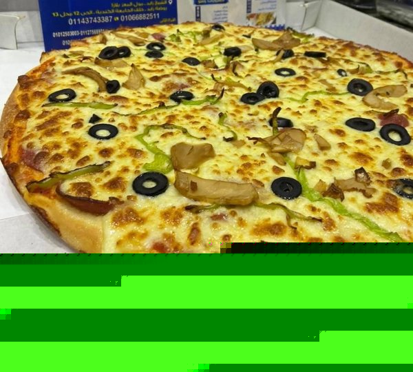 Mushroom, corn, vegetables, green olives, tomato sauce and mozzarella cheese