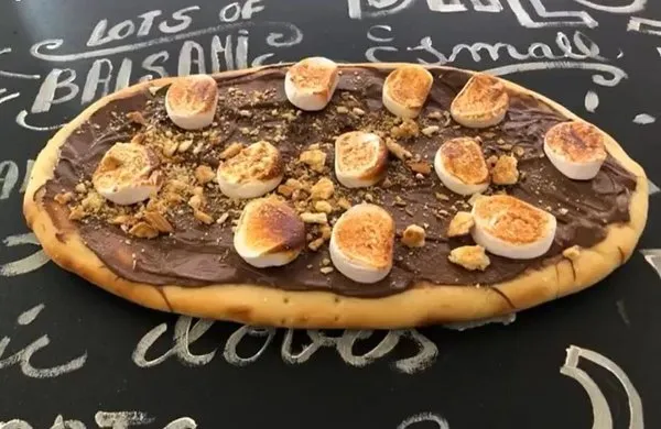 Nutella PizzaPizza dough covered with spread nutella, butter biscuits, marshmallows |