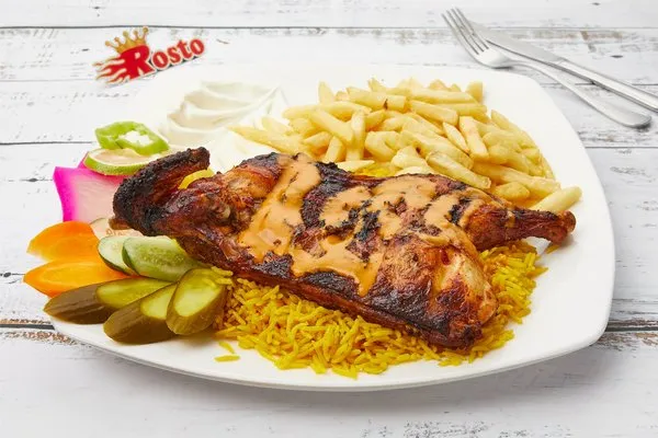 1/2 Charcoal Grilled ChickenGarlic dip, pickles, fries, rice, bread |