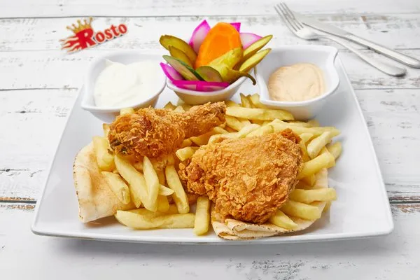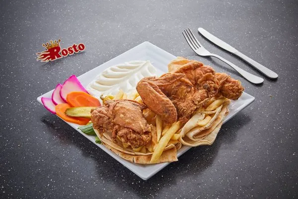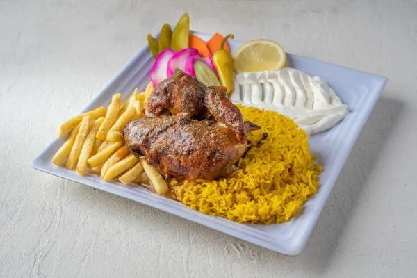 Charcoal Grilled ChickenGarlic dip, pickles, fries, rice, bread |