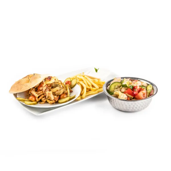 10 mini chicken shawerma,10 mini meat shawerma, fries, 2 coca and four dips (garlic dip, tehina, pickles and olives)