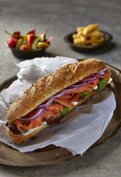 Smoked salmon over thinly sliced red onions, lemon creme cheese sprinkled with capers over rye bread