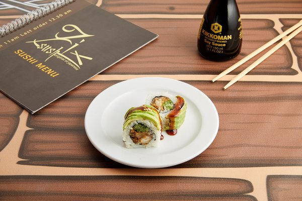 Crab, avocado, cucumber, wrapped with avocado, eel, sesame and teriyaki sauce