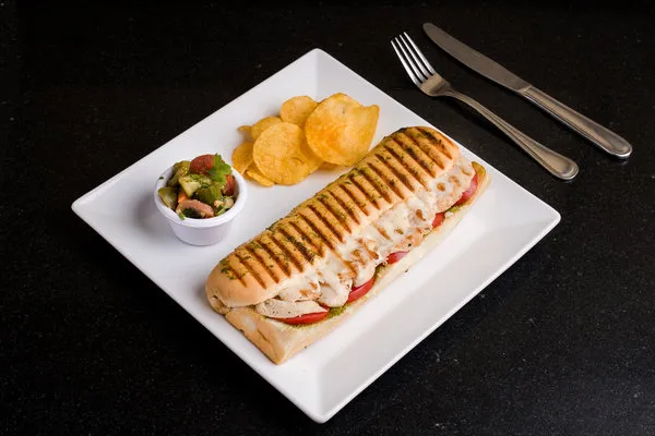 Grilled tender chicken slices, tomato, melted mozzarella & homemade pesto sauce
