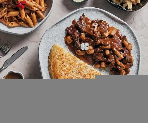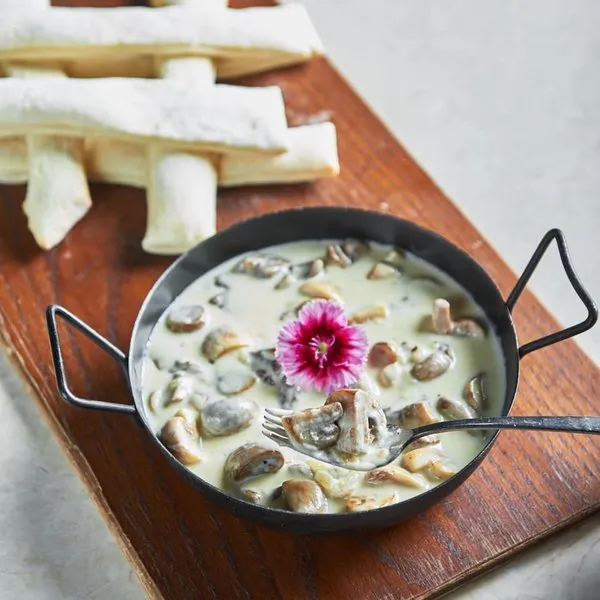 Slices of beef fillet in an earthy mushroom cream sauce served with French style white rice