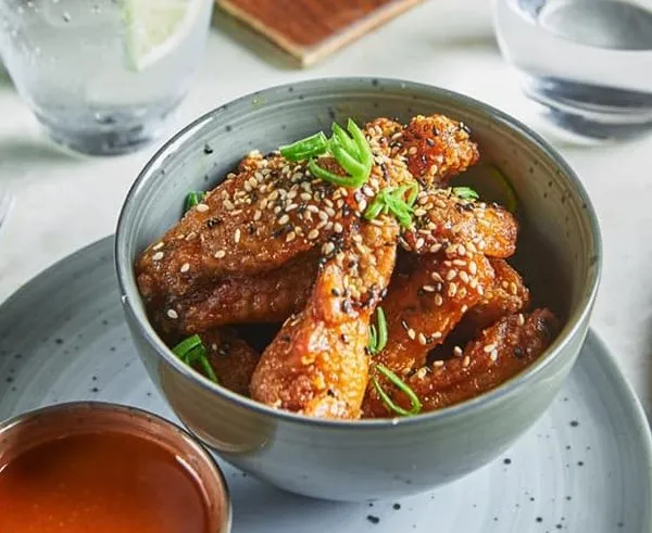 Chicken breast cubes tossed in an Asian inspired sweet yet sour sauce served with a side of steamed white rice and sauteed vegetables