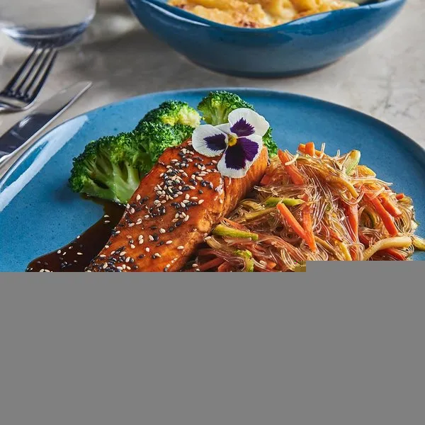 A perfectly cooked fillet of salmon glazed with our special teriyaki sauce, served with a side of glass noodles and steamed broccoli