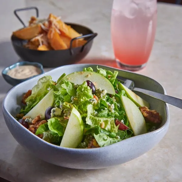 Marinated and panko breaded fried chicken breast topped with an arugula and cherry tomato salad, with a side of French fries