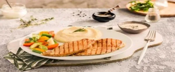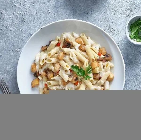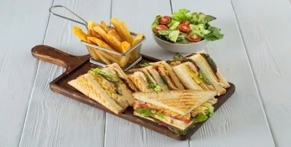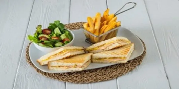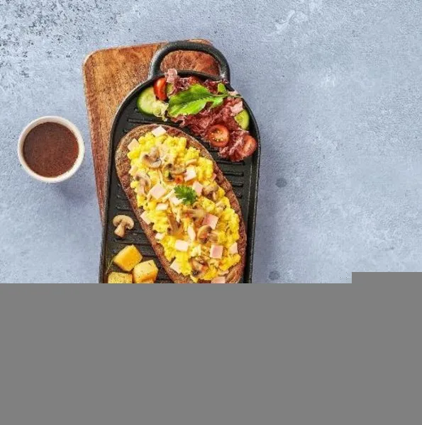Scrambled eggs, with roasted mushroom, smoked turkey and emmental cheese, served with roasted potato and side of fresh green salad