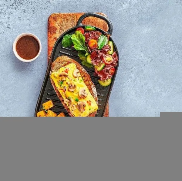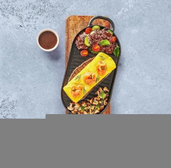 Our classic omelette with smoked salmon on freshly baked artisan bread, served with sauteed mushroom and side of fresh green salad