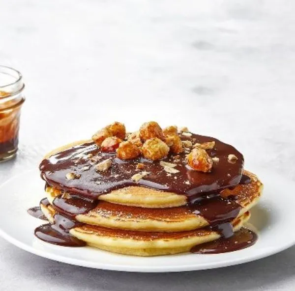 Fluffy house made pancakes topped with nutella, with caramelized hazelnut