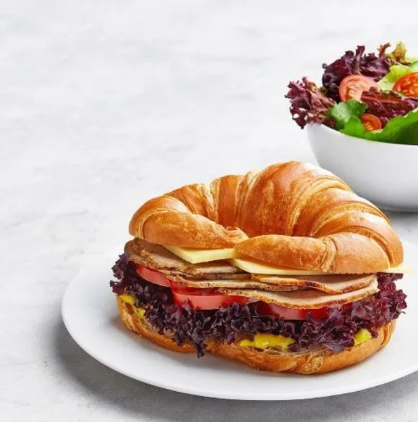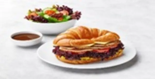Freshly baked croissant stuffed with roast beef, sliced tomato, and melted cheese, topped with mustard sauce and served with a side of fresh green salad