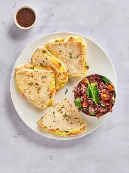 Scrambled eggs, salmon, mozzarella cheese and quesadilla bread