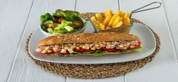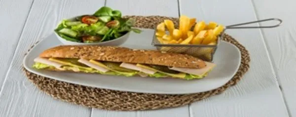 Fresh turkey, feta cheese, tomato, lettuce in a simit bread